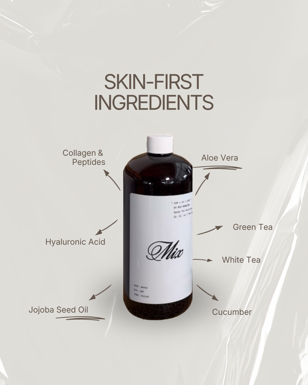 (Mix Sunless) tanning solution is enriched with skin-loving ingredients such as aloe vera, hyaluronic acid, collagen, jojoba seed oil, and cucumber extract. Whether you want a subtle glow or a deep bronze, our formulas work with your skin’s natural tone to create a flawless, even tan—without dryness, streaks, or orange tones.